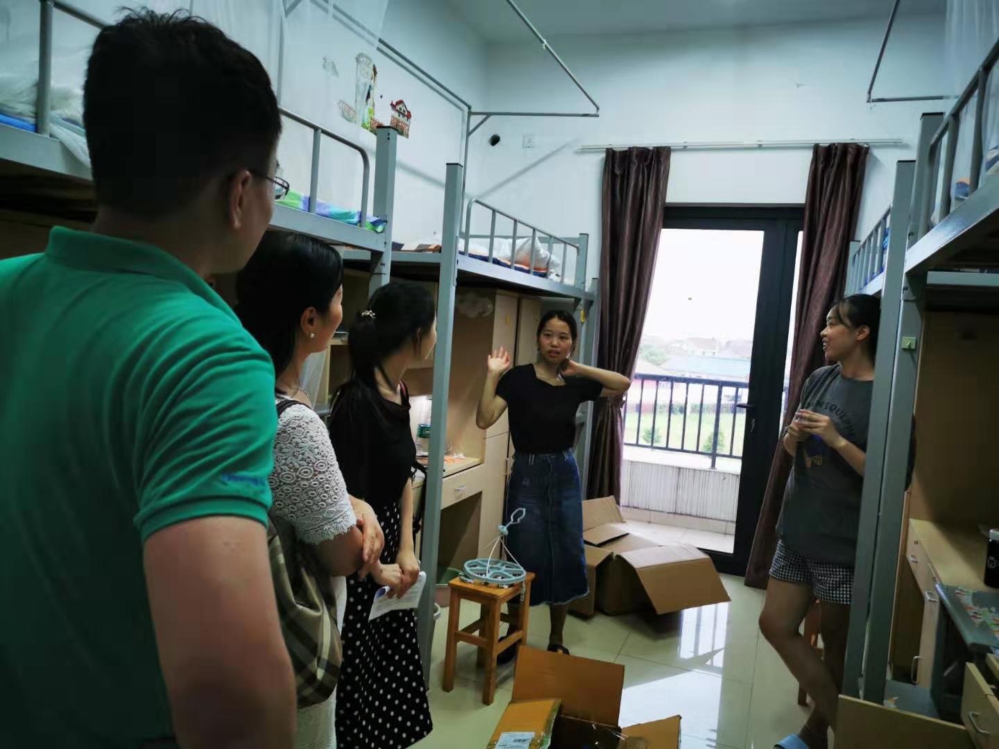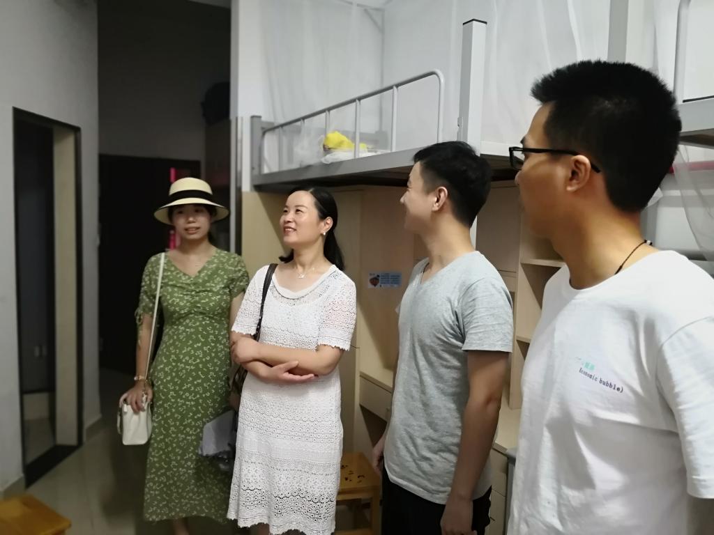 8月28日下午,91色情 党委副书记韩雯琛、学工办主任陈彬、国贸经济团队负责人章舒怡、研究生辅导员章浩燕,走进研究生新生寝室和同学们交流。